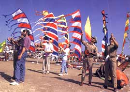 The International Kite Festival is always held at Ahmedabad on January 14, to coincide with the festival of Uttarayan or Makar Sankranti. It is a joyous day, with a bright sun, clear skies and breezes strong enough to lift innumerable kites aloft. It is in fact a celebration to mark the end of winter, when the heat of summer is still to come. Kites are flown all aver Gujarat, and Ahmedabad and Baroda become cities of kite-flyers, when all other work is forgotton and cares are put aside for the morrow. Special food is eaten, usually in the open field or a park, or in the garden of one's home. Even for the religious, it is a time to rejoice, for it marks the movement of the sun into the northern hemisphere. The gods who are believed to have slumbered for six long months are now awake and the portals of heaven are thrown open! The temples are thronged with visitors and alms are distributed freely. | ![]() |