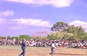 Kite-flying starts at dawn and continues without a pause throughout the day. Friends, neighbors and total strangers battle one another for supremacy and cries of triumph rend the air when someone cuts the line of a rival. A tremendous variety of kites is seen and the connoisseur can choose precisely what he wants. Even the lines with which the kites are flown are specially prepared by experts before the great day. |
